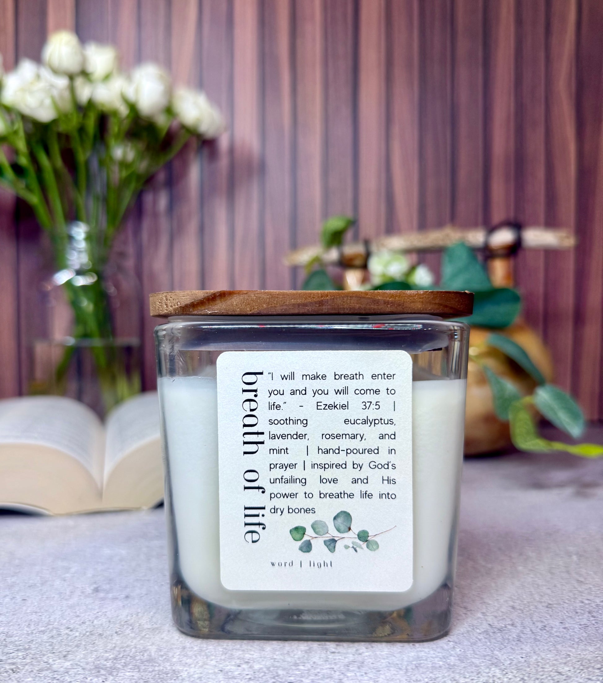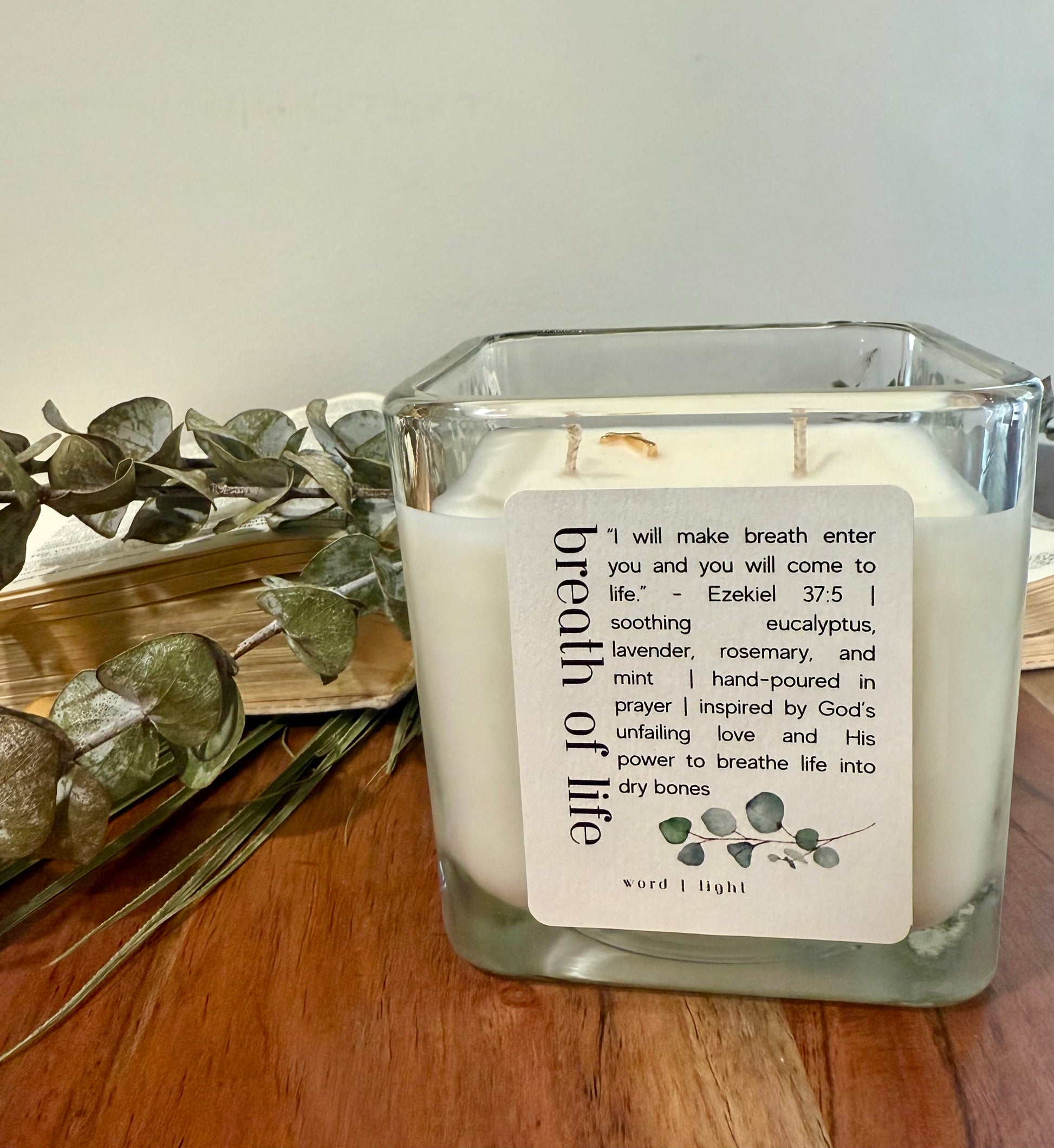The breath of life candle is crafted with traditional healing fragrances, including eucalyptus and mint for easy breathing, and soothing lavender and rosemary for relaxation. It is a reminder that when we fear our hope and future are gone, God is there to breath life back into us.
