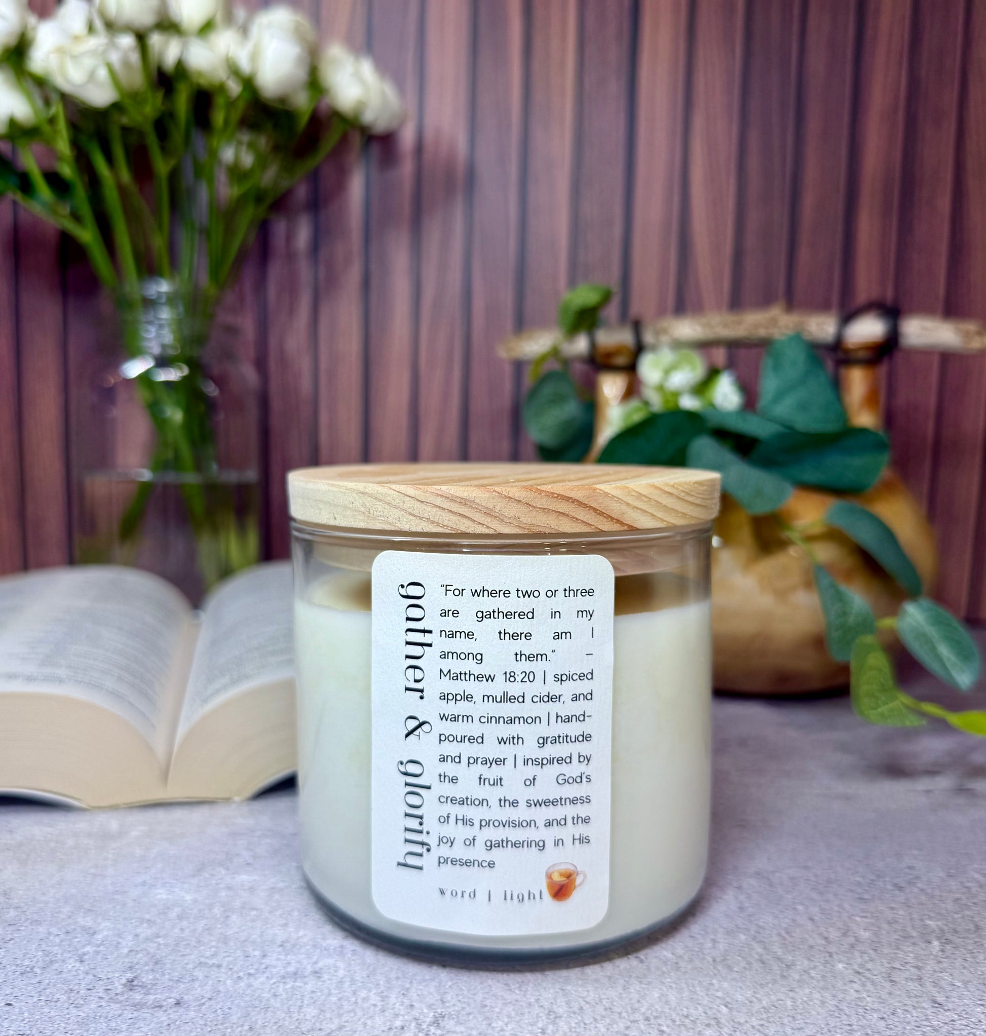 A sweet and spicy blend of apple, mulled cider, and warm cinnamon, gather & glorify was crafted during prayerful reflection on the gospel of Matthew, chapter 18, verse 20.