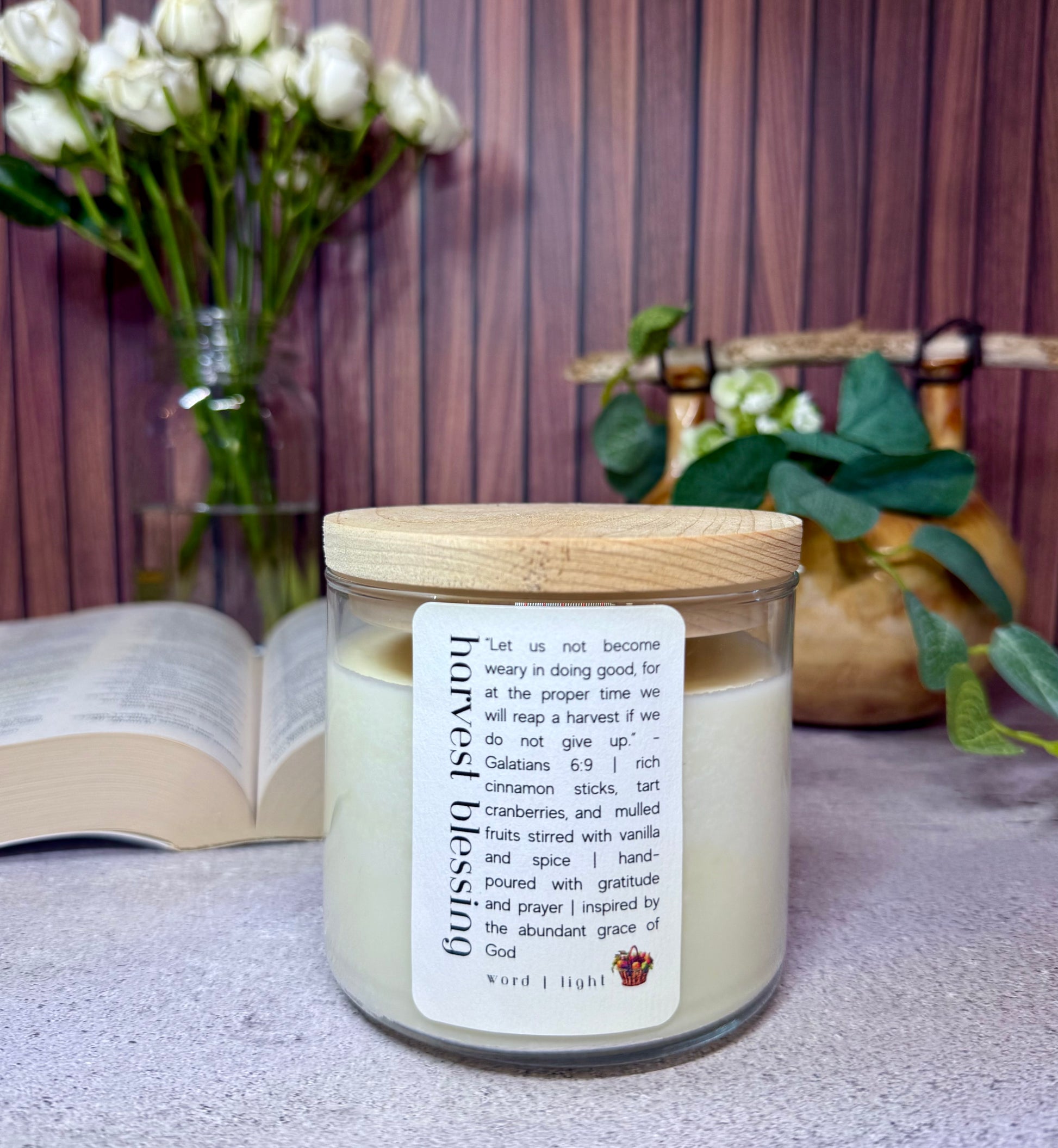 Rich cinnamon sticks, tart cranberries, and mulled fruits stirred with vanilla and spice give harvest blessings a unique autumn fragrance. Inspired by the abundant grace of God, harvest blessings was crafted during prayerful reflection on Galatians 6:9.