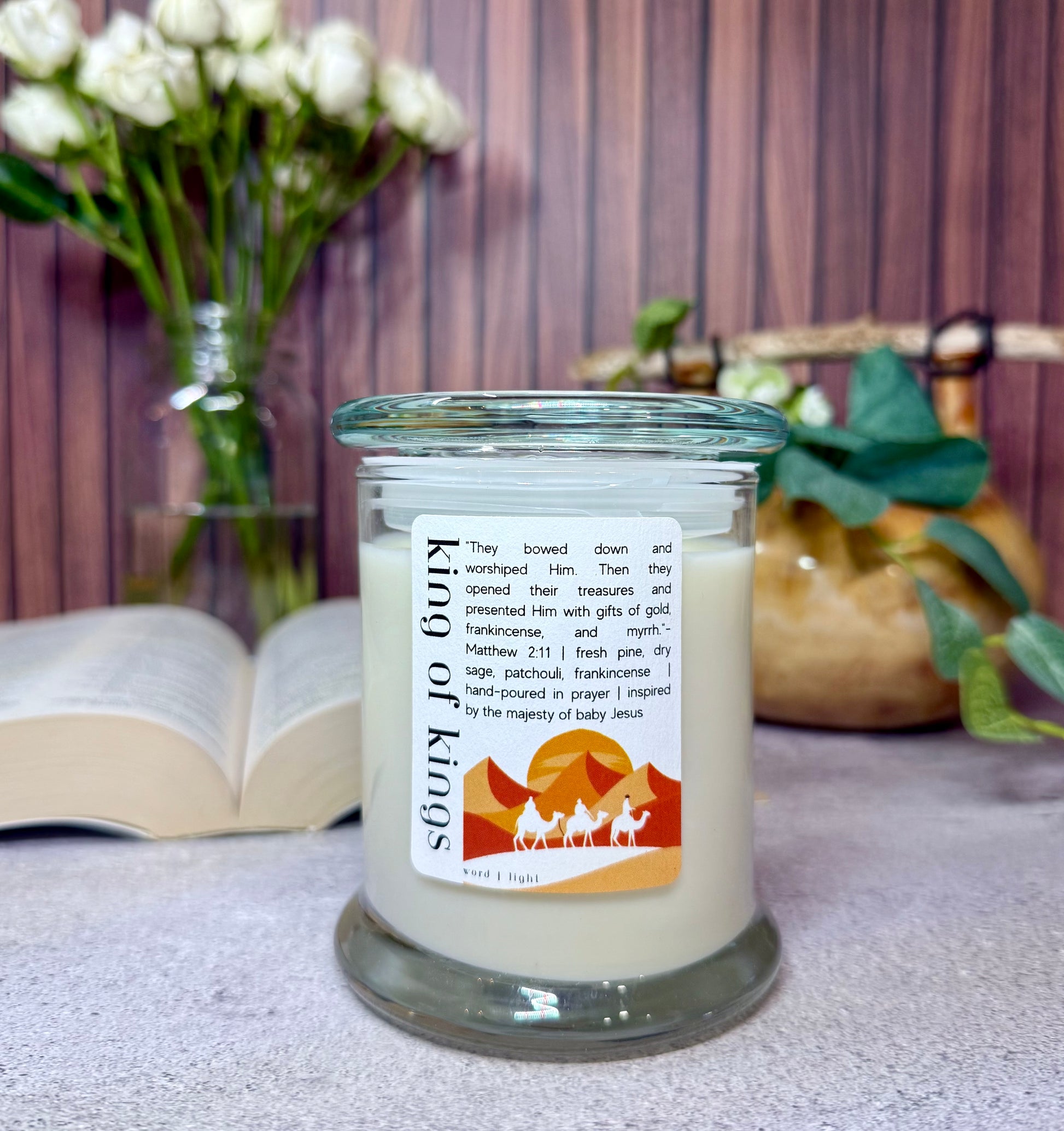 King of Kings is a 9 oz. soy candle offering 40+ hours of burn time and featuring a fragrance of fresh pine, dry sage, patchouli, and frankincense. It is hand-poured into a premium glass vessel and paired with a luxury glass lid.
