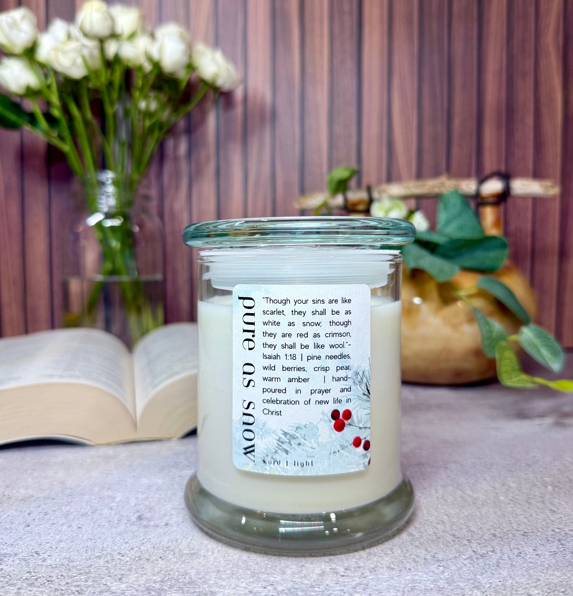 Pure as snow is a 9 oz. soy candle with 40+ hours of burn time, fragranced with pine needles, wild berries, crisp pear, and warm amber. It is hand-poured into a premium glass vessel and paired with a luxury lid.